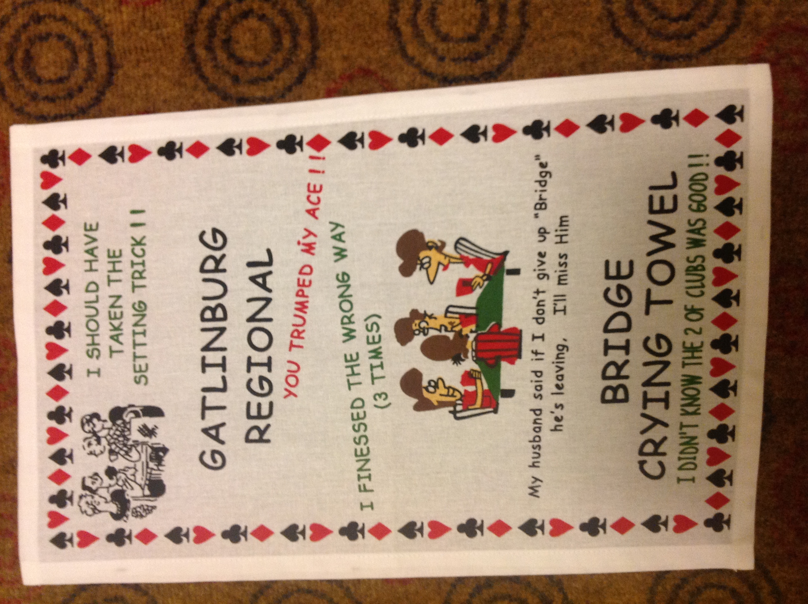 And that’s all the fun we can have this year in Gatlinburg. Six prime-time KO’s plus the morning. Two third/fourth overall placings, plus 15th in the loser swiss teams. Not a great result this year, sad to say, maybe 40 masterpoints. A really great cabin Bob is already booking for next year. All the same restaurants, all the same kitschy stores. The drive through the Smoky Mountain National Forest is as beautiful as ever, changing planes in Dallas as tedious as always.