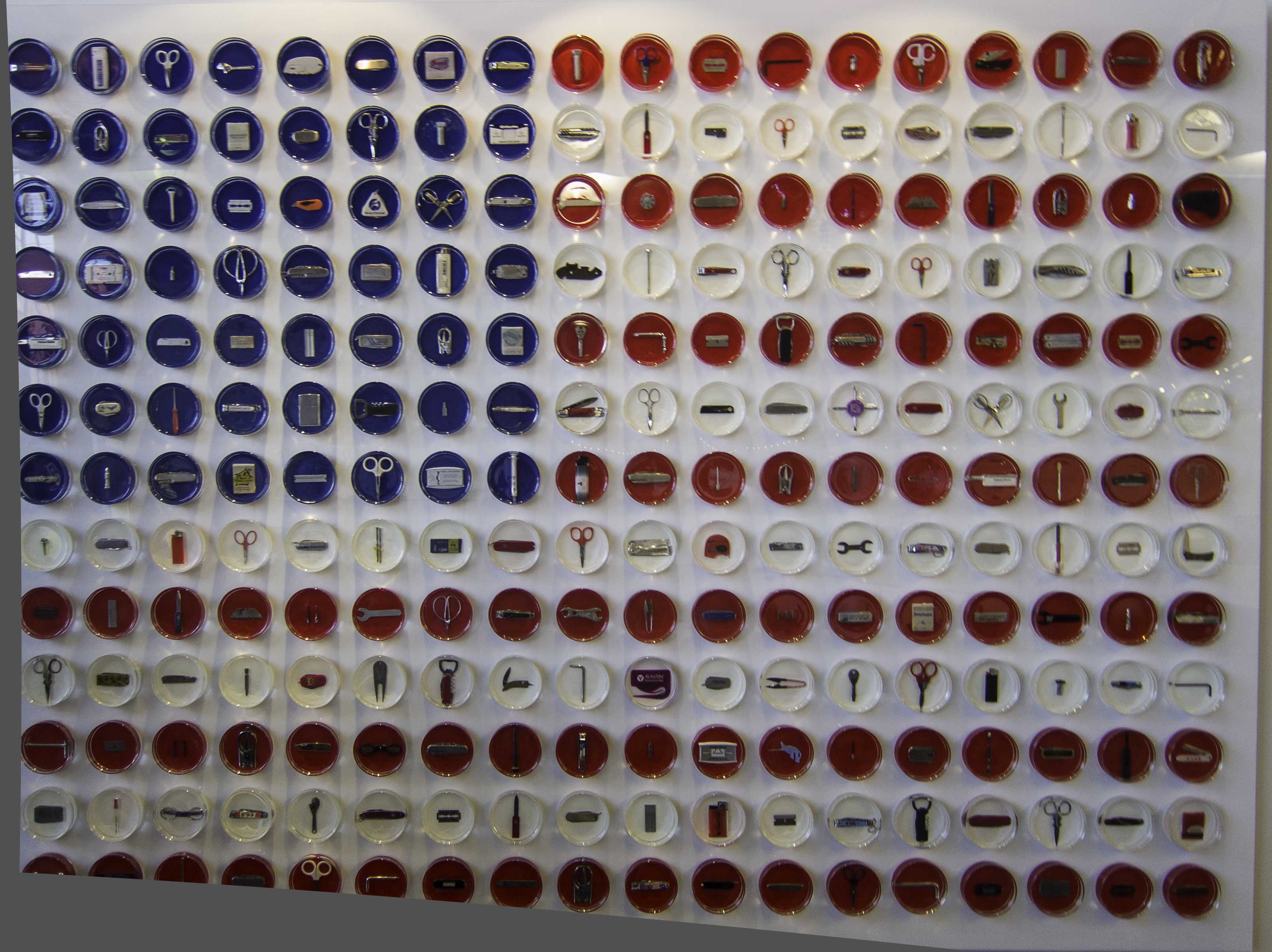 Pred then makes these items into her own, particularly subversive, art. This flag is composed of 234 separate items forcibly removed from us. Notice the tiny tiny embroidery scissors. The screwdrivers. The little wrenches–what were the dreaded Islamofascist terrorists supposed to do, unbolt the airplane from the inside?