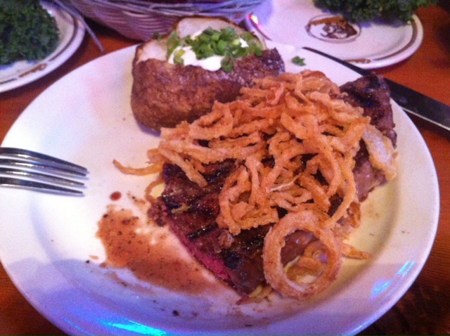 Just to make sure that I got my quote of saturated fats, the rib eye comes topped with onion rings. Then there is the baked potato, with butter and sour cream. If I’m going off the wagon, I’m going all the way.