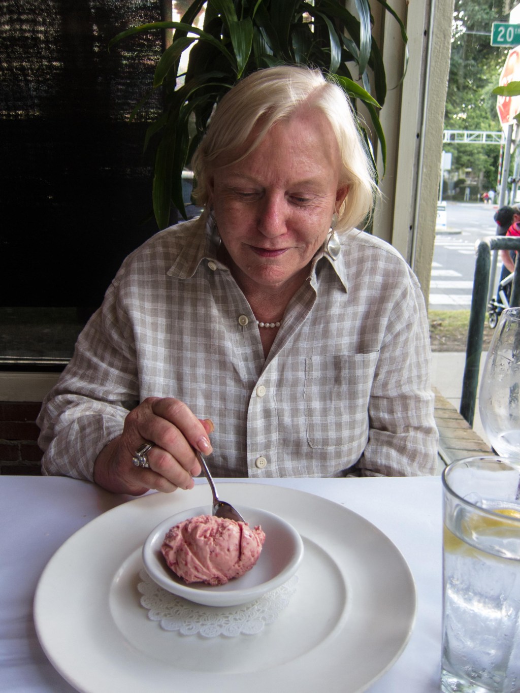 We were full. No room at the inn. Ready to leave, but the waitress, doing her job of trying to sell more, couldn’t miss telling us about the house-made strawberry ice cream. Fortunately for me, Gail is addicted to fresh strawberry ice cream, so we had to order it.