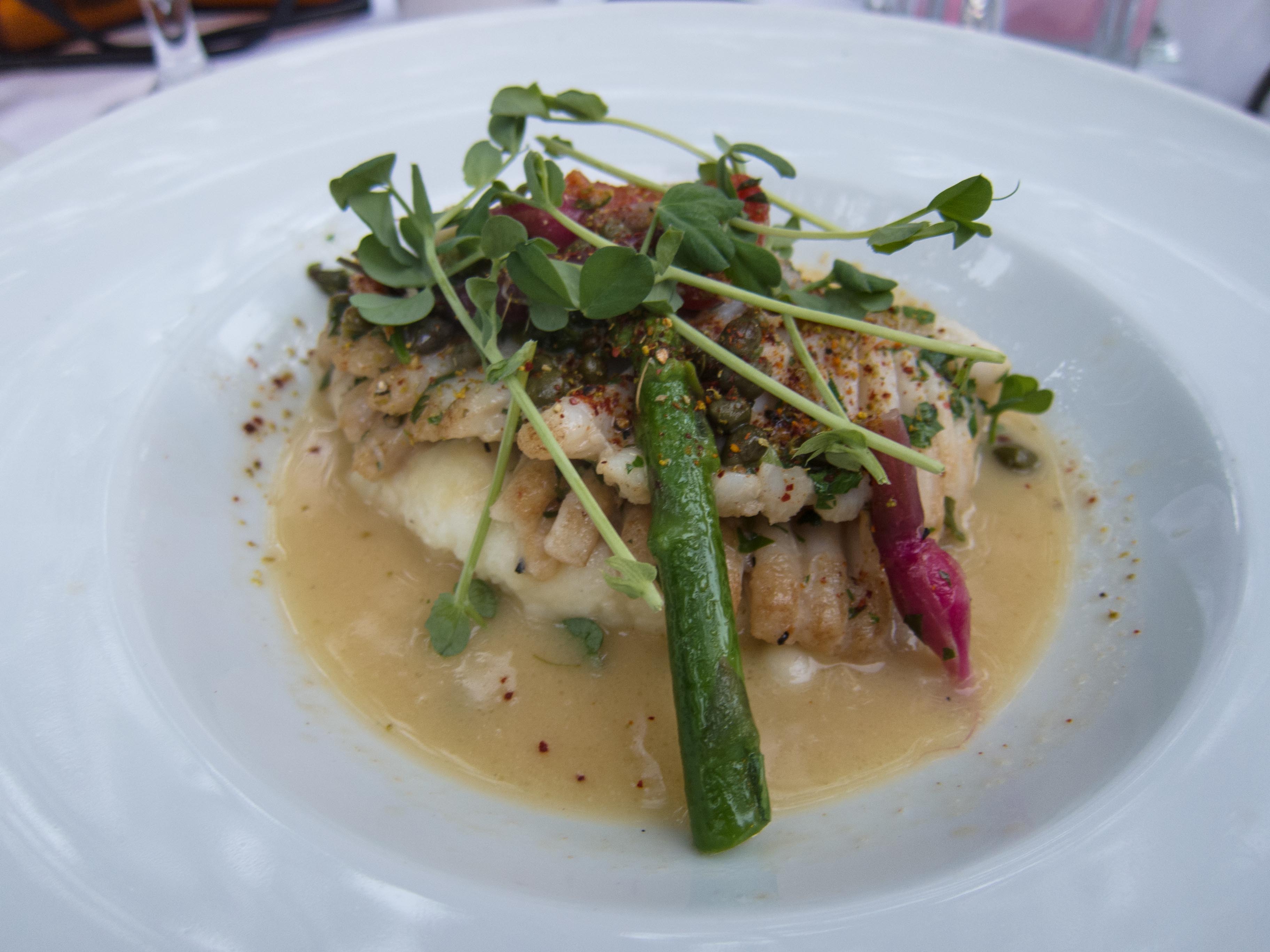 The special this week was Massachusetts skate wing, a marvelous piece of fish you rarely find. The chef did a magnificent job of preparing it, served on very thick, creamy mashed potatoes with a unique vegetable melange which included some very tiny purple carrots. I’ve never seen anything like it before.
