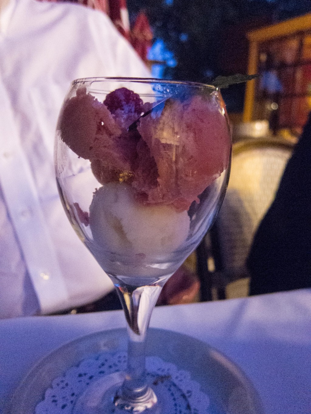 So there I was, enjoying my skate, and Gail offered me a taste of her filet. I bit into it, and chewed, and chewed, and chewed. I don’t know what kind of meat that was, or where they bought it, but it was decidedly not what you would expect from a $44 filet in a first rate restaurant. It was dreadful. It may have been camel meat. Gail sent it away, not wanting anything else.