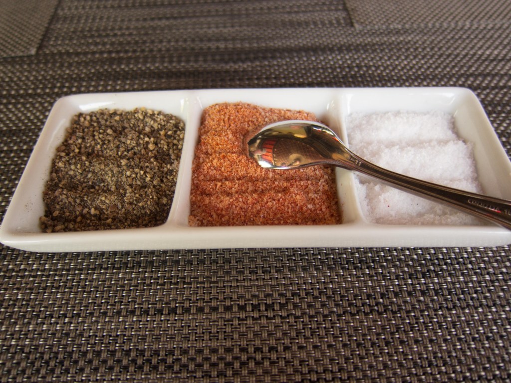 Coarse ground pepper on the left, see salt on the right, smoked hot paprika and salt in the middle. A very nice touch.