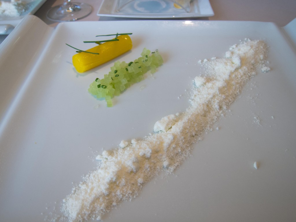 The caviar is accompanied by phenomenal small breads, and a plate containing creme fraiche which has been flash frozen to make it like a powder, which promptly thaws back into a cream. Cucumbers minced microscopic and some kind of tube of egg yolk custard complete the accompaniments.
