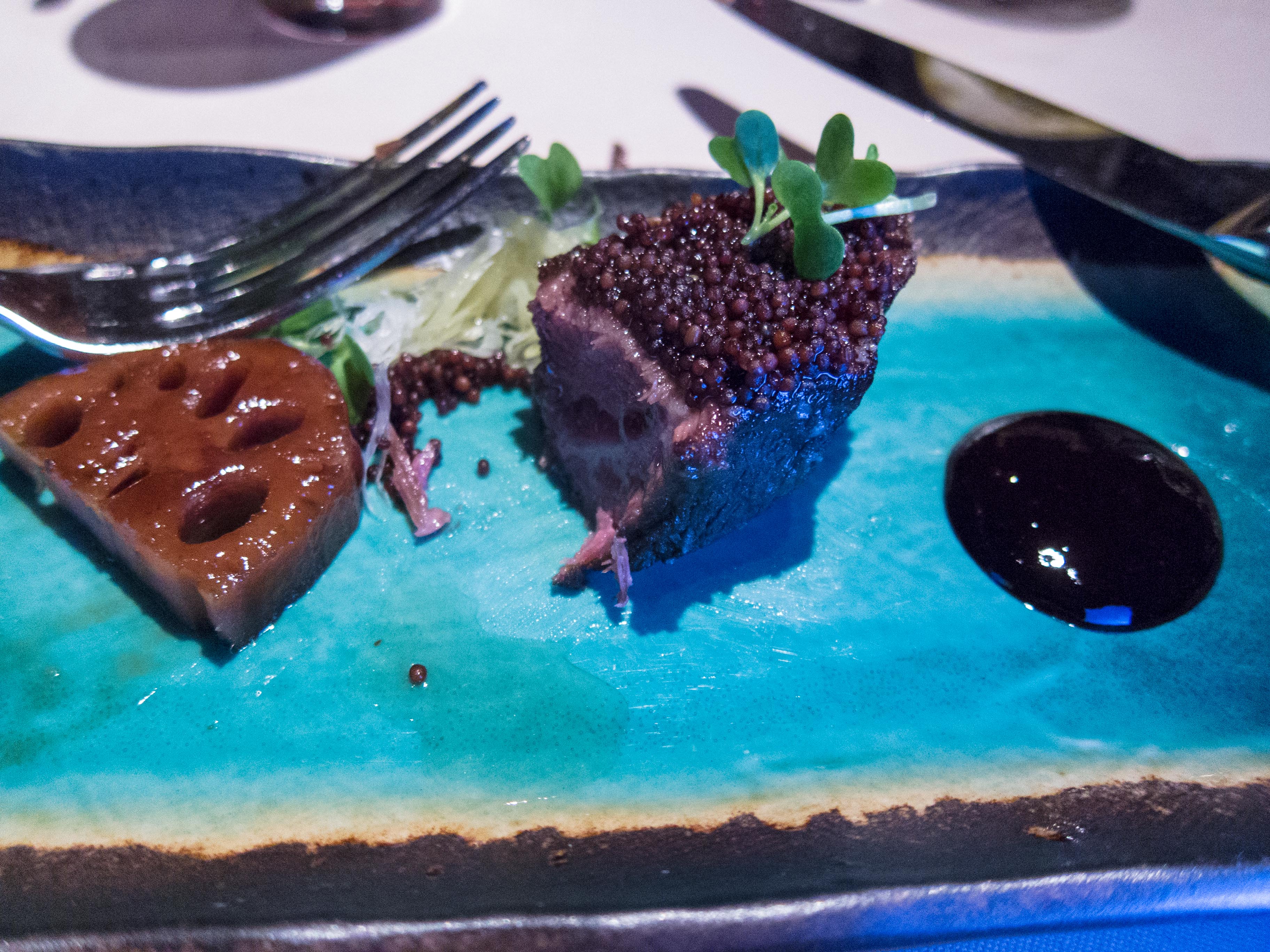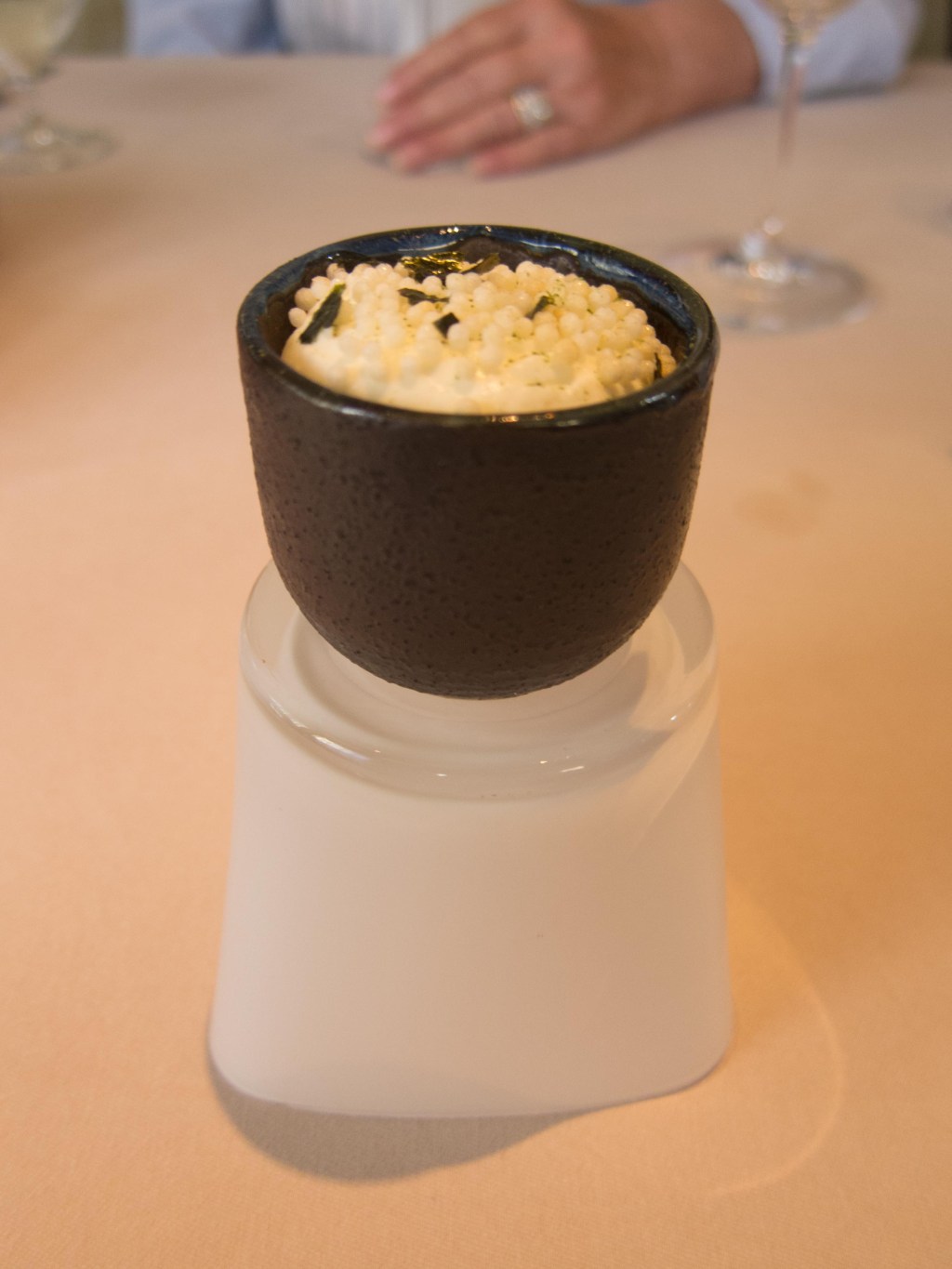 When you are having a lot of courses, each one can be very small. This “parfait” had three or four layers of goodness inside a cup that held perhaps an ounce and a half. I wish I could remember what was in it; I do remember that the little balls on top were very crunchy and added a level of texture to the dish.