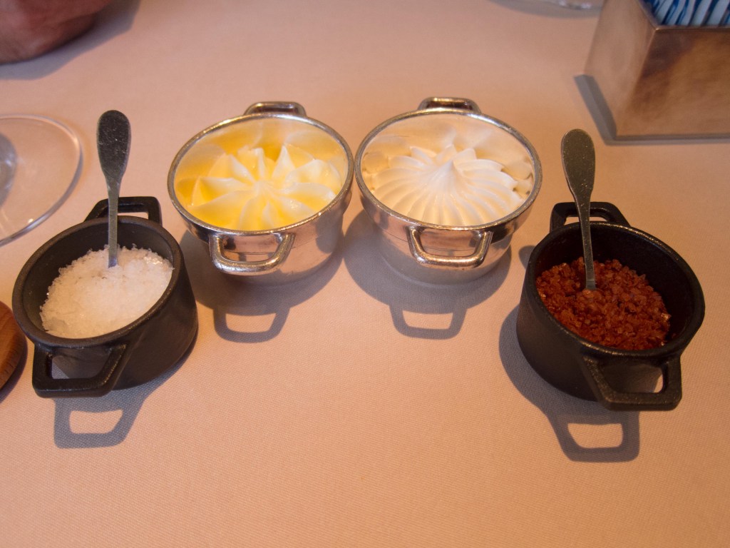 The meal begins with a tower of amuse bouches designed to wake up and sharpen your taste buds in all 5 of the flavor groups–sweet, sour, salty, bitter and umami. The small red item on the spoon in the photo below is the sweet, which is somehow magically encapsulated in such a way that it “pops” in your mouth, exploding with flavor. That sort of technical trickery is a hallmark of the molecular gastronomy movement, which (it seems to me) is often used to substitute kitchen technique for flavor, but not at Cyrus. They use the kitchen wizardry in the service of the food, sparingly, not just to have flash and glitter in their presentations.