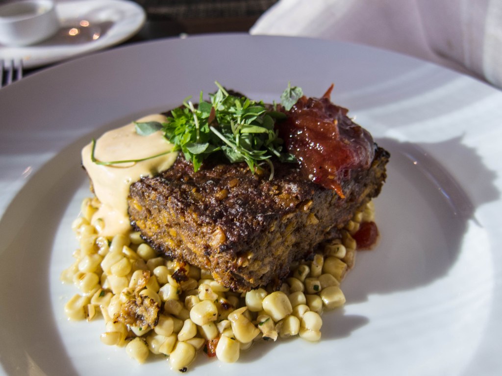 A bed of roasted corn, a square of meat loaf and a topping of tomato jam. Looks turned out to be deceiving.