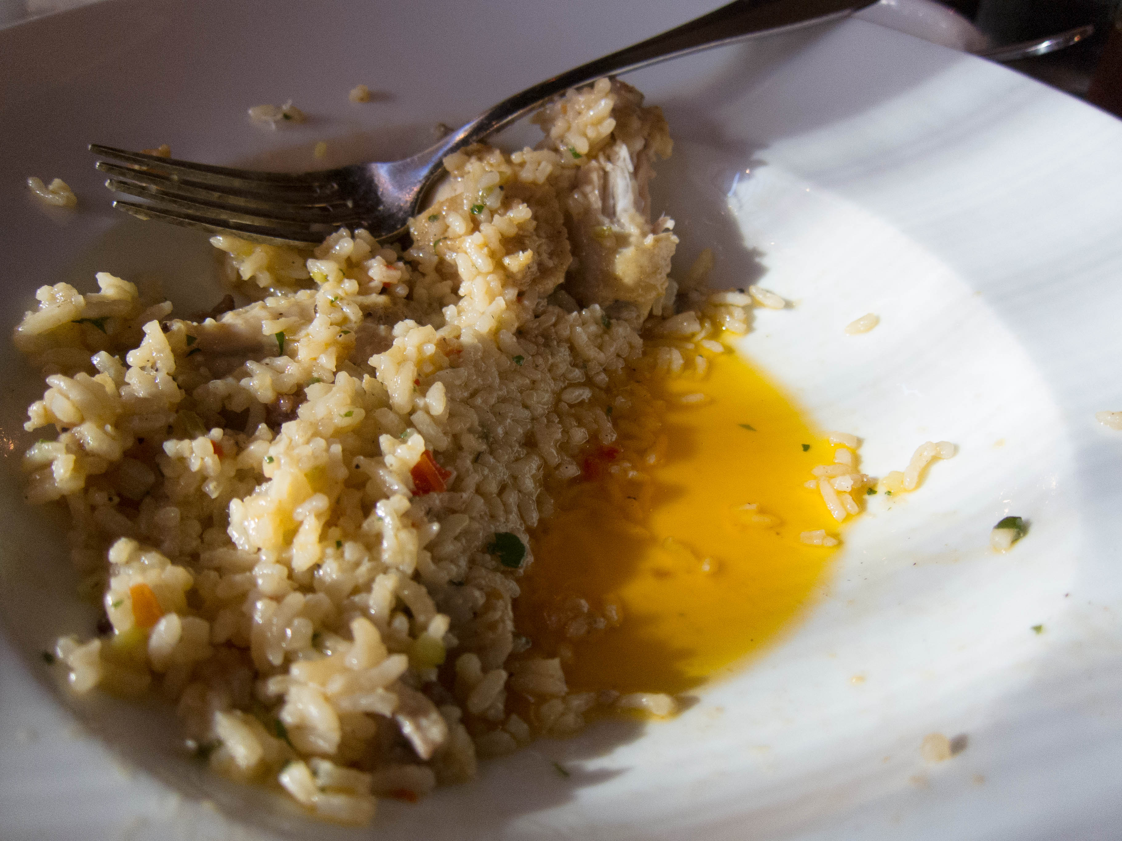 I had the risotto Jambalaya. It isn’t often that I say a dish isn’t spicy enough, since I’m a sissy about spicy foods, but this was pretty bland. At first, I wasn’t going to have a photo, because the presentation wasn’t particularly interesting–it’s just a bowl of rice and seafood, after all. But then, as I got to the bottom of the plate, I found an orange pool of oil.
