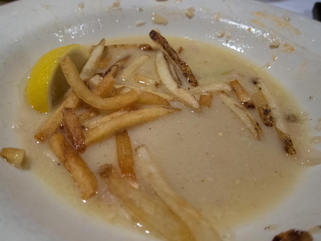 Gail doesn’t care from mussels, but fortunately Mary does. The mussels were served with french fries, which in turn were covered in aioli. When the mussels were done, Gail and Ted started dredging the fries in the leftover sauce, or juice, or whatever that odd liquid is called. They even called in the leftover fries from Linda’s plate for more dipping. This may start a new trend, and a nationwide chain of fry and mussel stores.