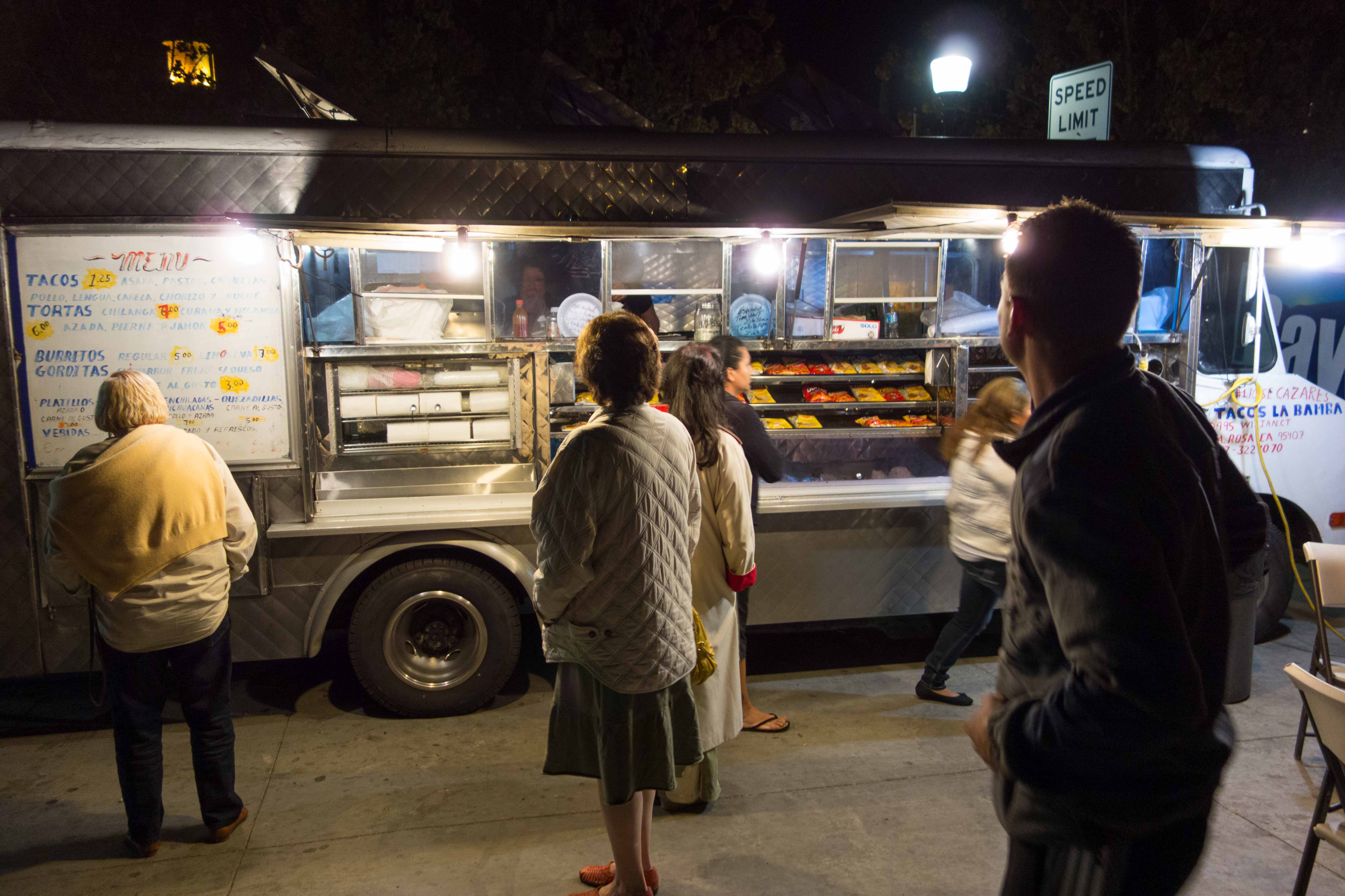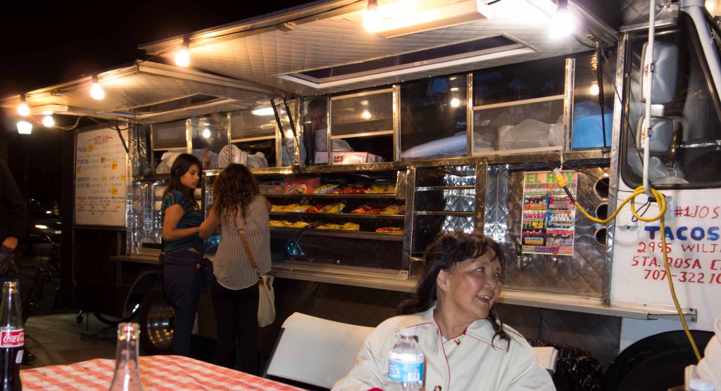 Along the Sonoma Highway, in the evenings after the regular business close, arrive a line of taco trucks, to set up an informal gourmet alley of authentic comida Mexicana.