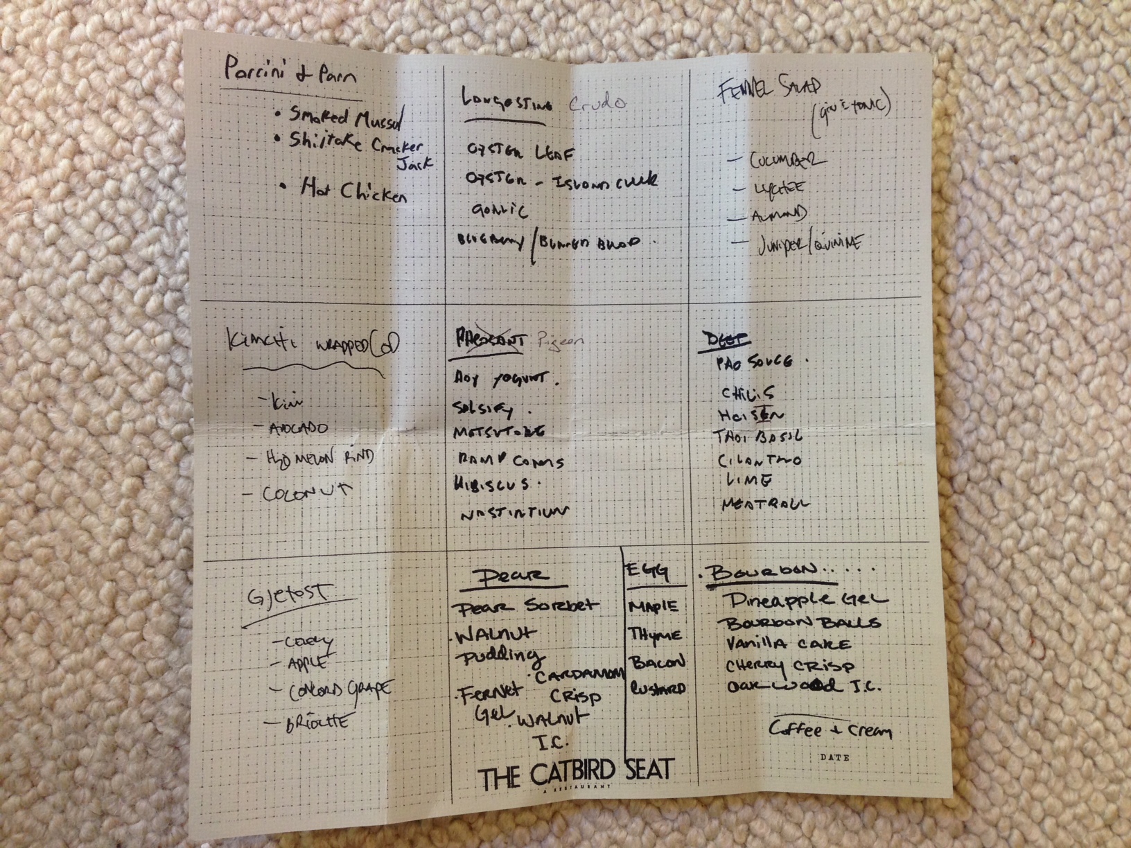 It’s a chef’s work sheet, where they plan out the entire meal every Tuesday. The two handwritings indicate the which dish each chef will prepare. Of course, it puts paid to the notion that “The details of what you’ll be savoring at your meal won’t be determined until you’re there” but what’s a little marketing hype among friends?