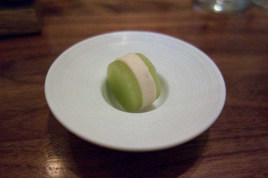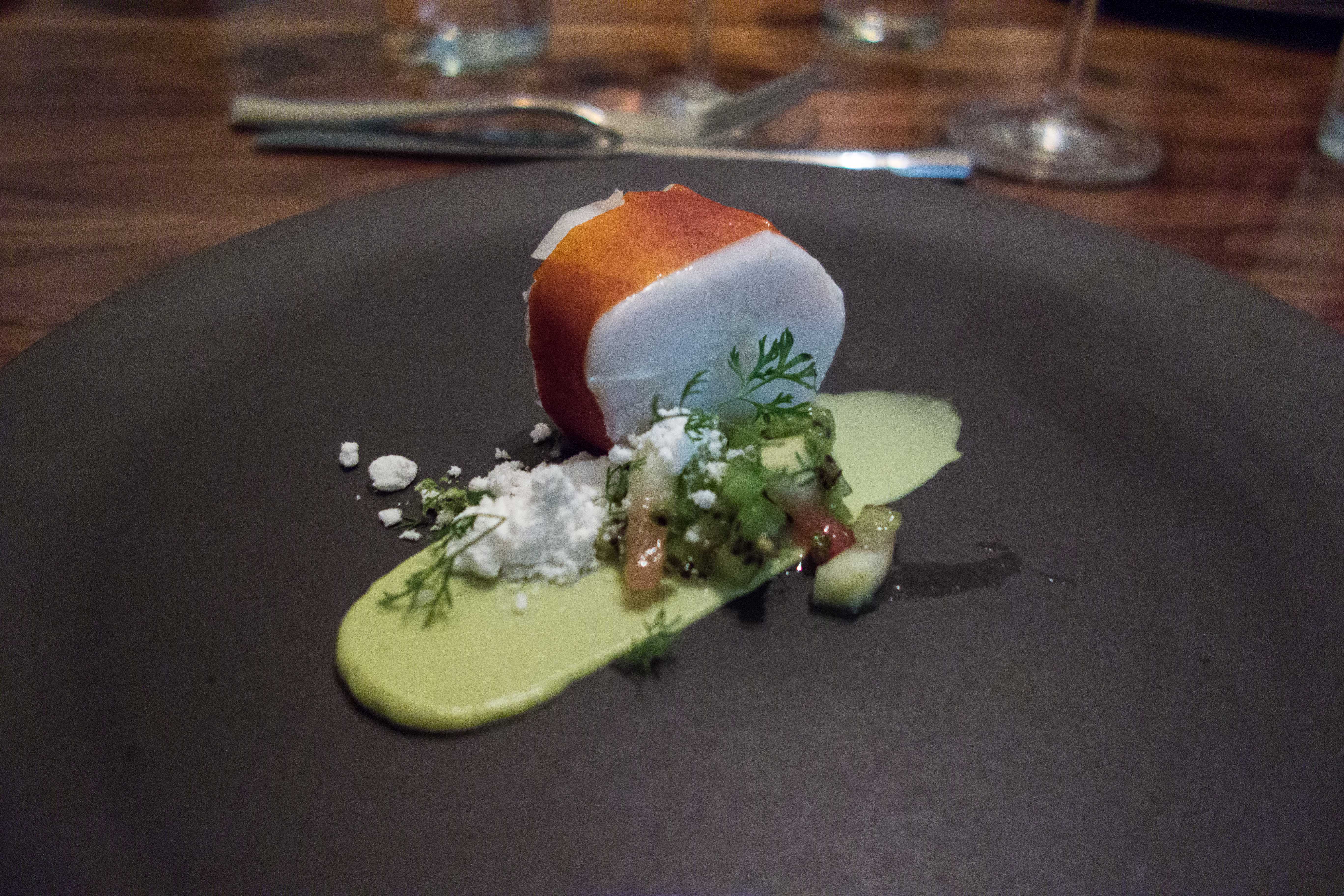This was one of the more polarizing dishes–I loved it, Tracy hated it. A piece of cod, wrapped in kimchi on a bed of avocado with a watermelon rind/coconut salad. I thought the cod was done perfectly, she thought it was undercooked. In any event, the presentation was beautiful.