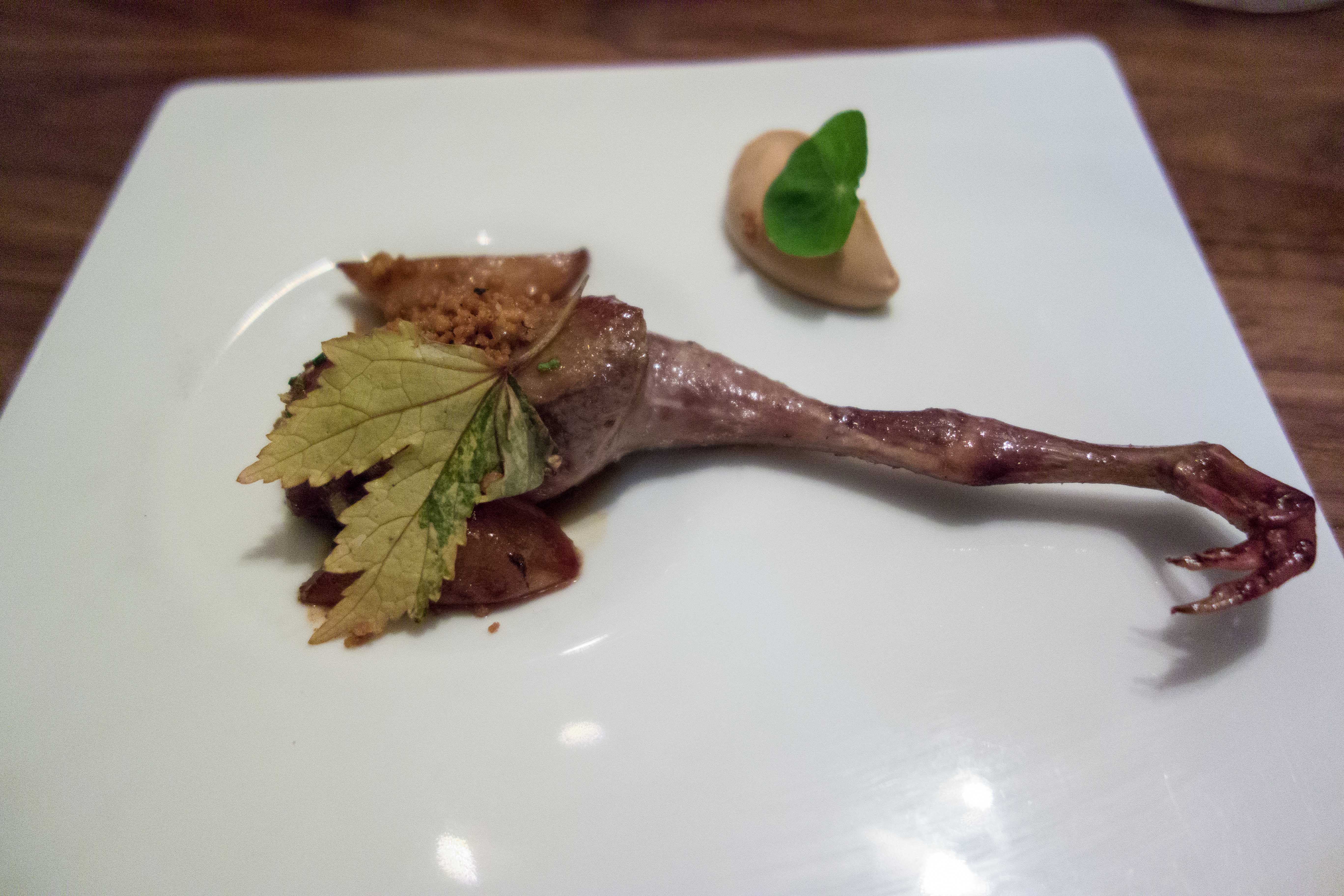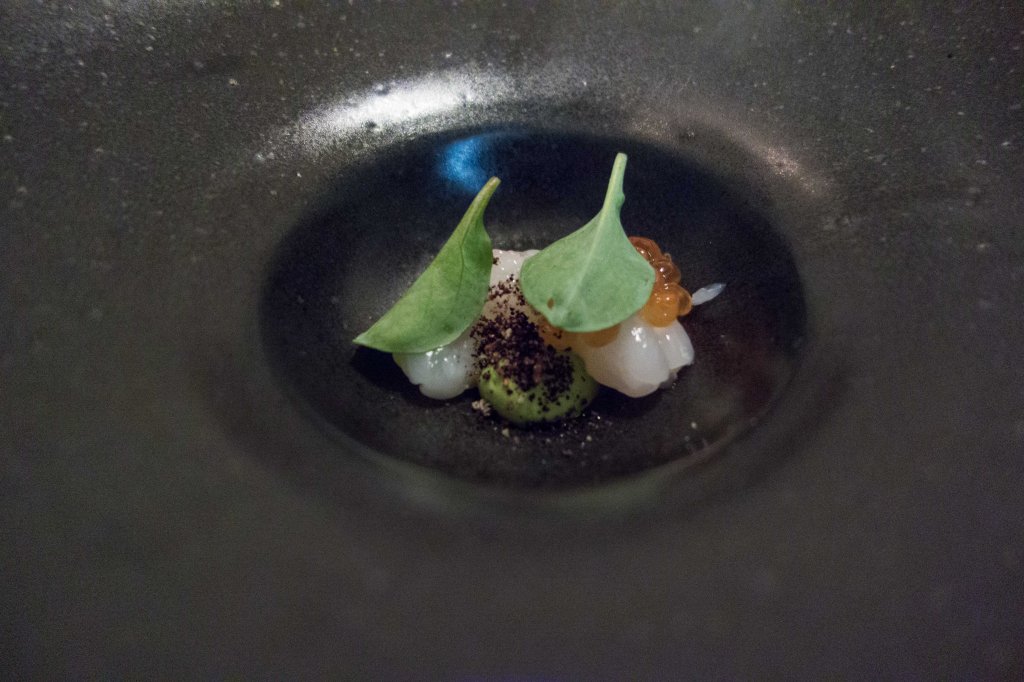 A langostine is somewhere between a shrimp and a lobster. This dish had one of them, an oyster, garlic, some crumbles of something bluberry-ish and some oyster leaves, which are supposed to taste just like oysters, on top. The leaves were interesting. I eat sushi, raw fish doesn’t faze me, but this just wasn’t pleasant. The texture of raw langostines is nothing you want to get familiar with, I can tell you now.