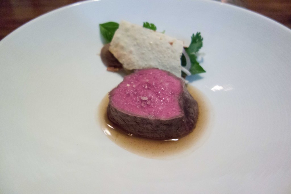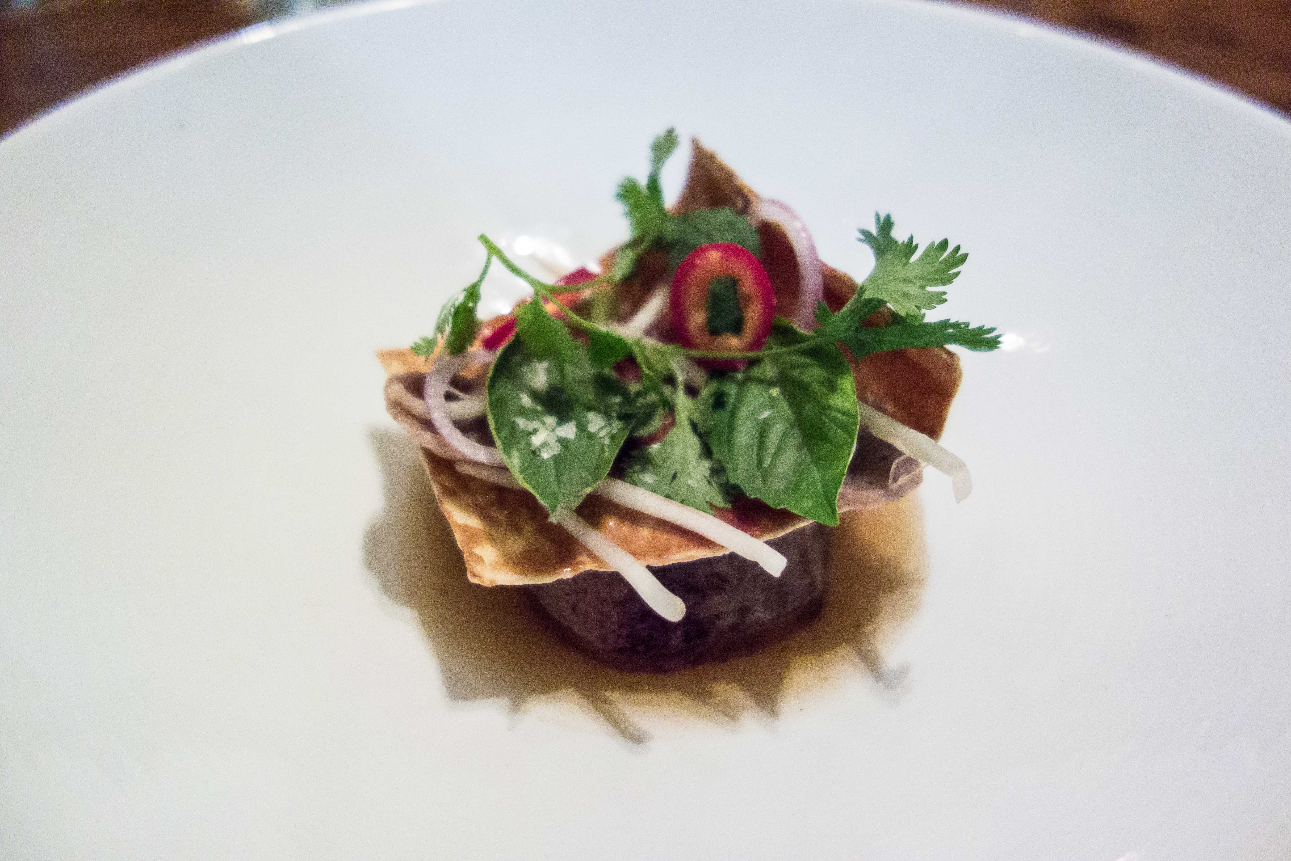 If you aspire to be a famous chef, you can’t just put a piece of beef on a plate, you have to do something strange with it. In this case, they tried to reinvent pho, that basic soup of Thai and Vietnamese cuisine. A piece of wagyu beef was placed in the bowl with a tablespoon of broth, topped with a cracker coated in hoisin sauce with cilantro, Thai basil, lime and chilis and garnished with a couple of slices of some kind of meatball.