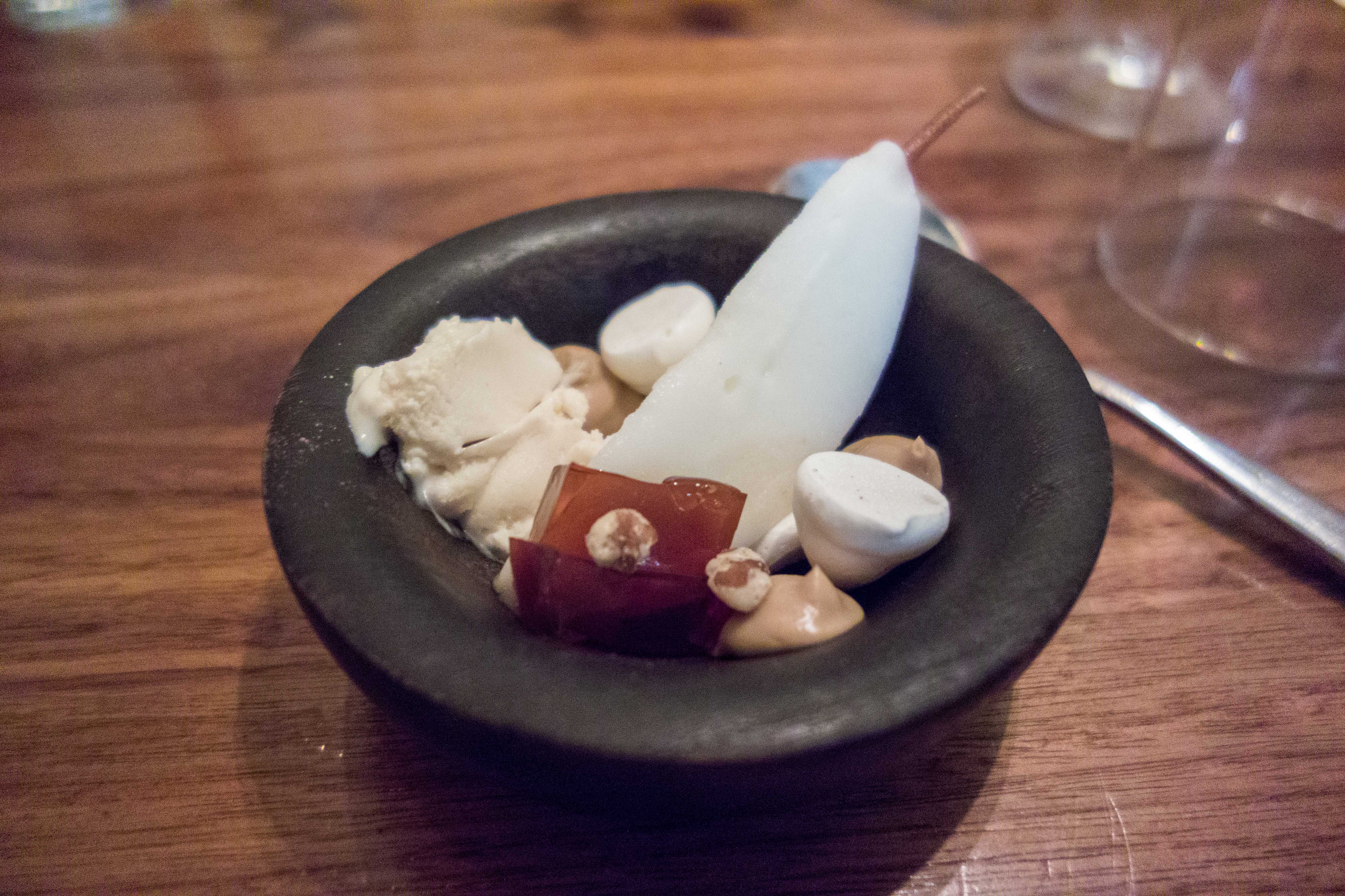 One of the hallmarks of molecular gastronomy is recreating a food from its elements. I don’t know why they do this. The first dessert looks like a slice of pear, but it is really pear sorbet molded into the correct shape, and adorned with a stem made of chocolate. A real slice of pear would be better, but you don’t make the big leagues in chefdom that way. This dish also had black walnut ice cream, walnut pudding and a Fernet Branca gel. That part was bizarre–Fernet Branca is a very bitter aperitif and has no place in a dessert. We liked most of the dish, although it was hopelessly frenetic, but absolutely hated the gel.