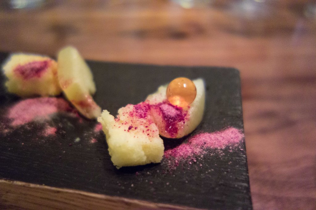 The cheese course was magnificent. Gjetost is a Norwegian goat’s milk cheese, very dense and sweet. The chef said it reminds him of peanut butter (yes, he actually spoke to us) and paired it with concord grape. Every one of us loved it.