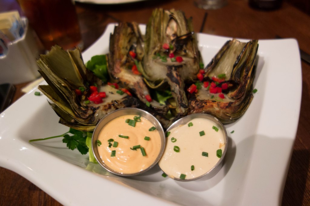 Nonetheless, large is what they have.  Which doesn’t mean we have to try everything.  Gail and I have eaten there 4 or 5 times now, and keep having the same things.  Gail is ecstatic over their artichokes.  Steamed, cored and then grilled, they are always cooked to perfection and accompanied by two kinds of sauce, aioli and chipotle.