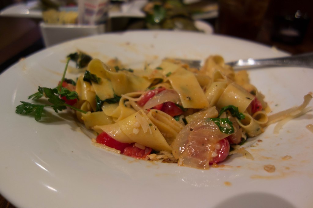 Pappardelle. The dish looks better before I dive in–but I couldn’t wait and the photo came after I started.