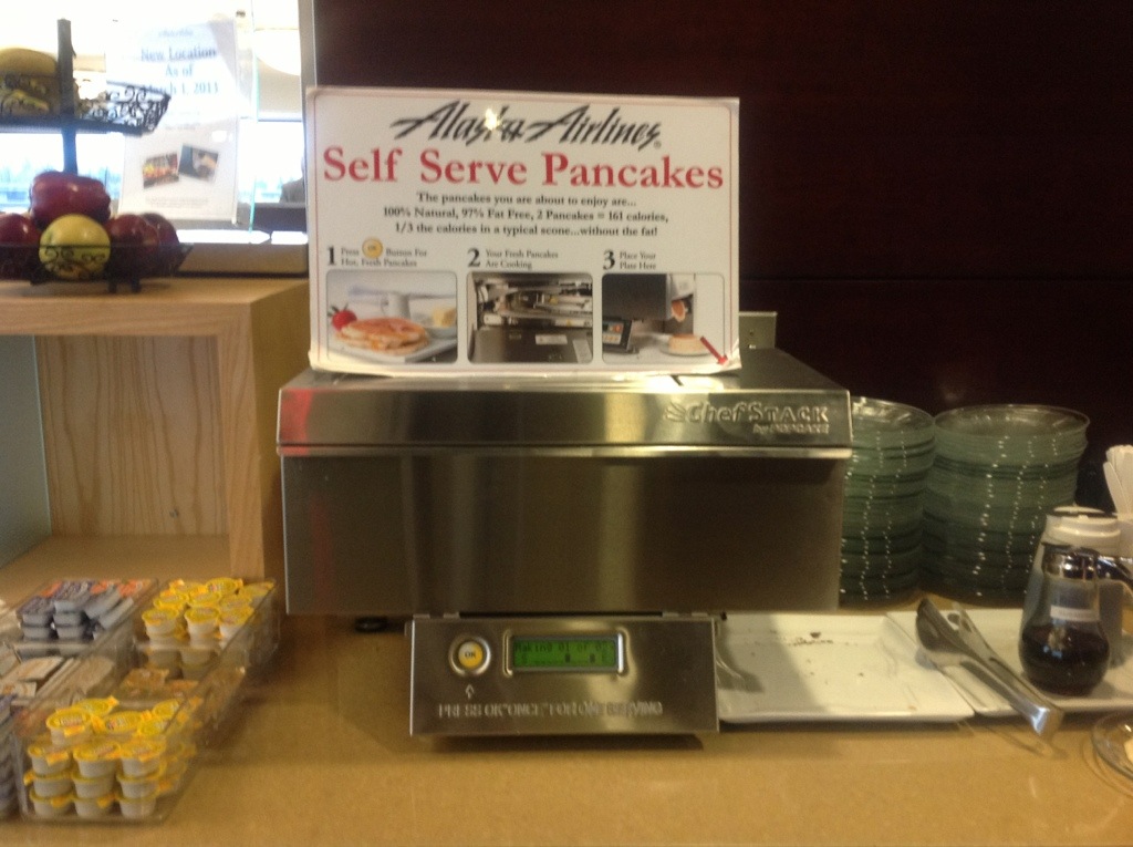 However everything is an adventure. With my two and a half hour layover in Seattle I’m in the Admirals Club and what do I see but a pancake machine.