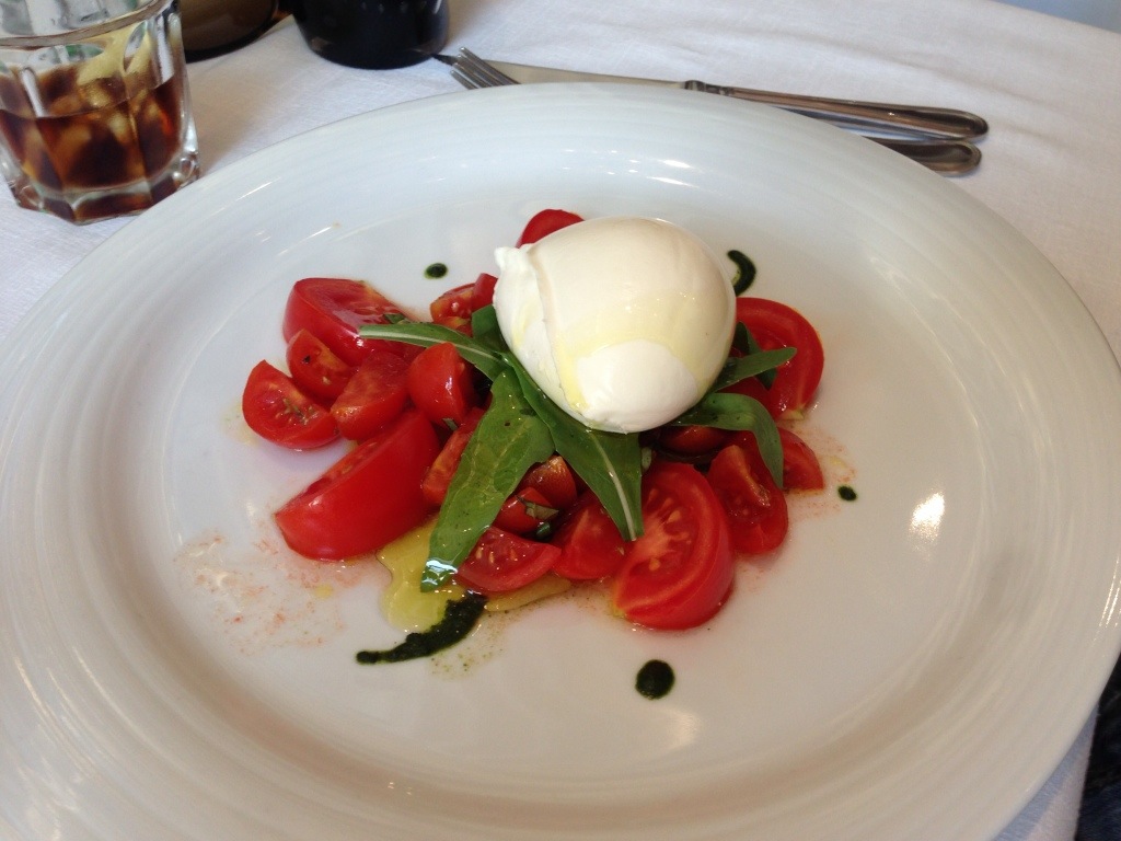 Brad had a Caprese salad, which is what I usually have. It looked, and tasted, simply wonderful. The local tomatoes are rich and ripe. The mozzarella was made within the last few days, maybe hours. The balsamic vinegar is of a much higher quality, the basil leaves were fresh picked.
