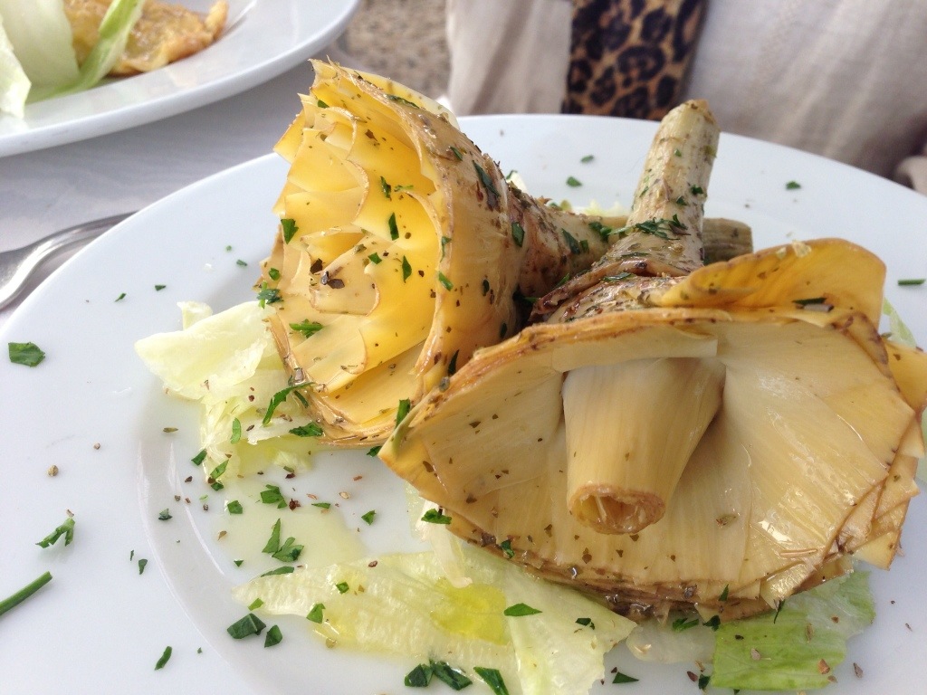 We ate lunch today in a trattoria our taxi driver was touting–maybe it’s really good, maybe his cousin owns it. The food in general was decent, but the artichoke was spectacular. This is clearly a different type of artichoke than we get from Castroville, and it was cooked then marinated in oil and spice. Every last bit of it was not only edible but delicious.