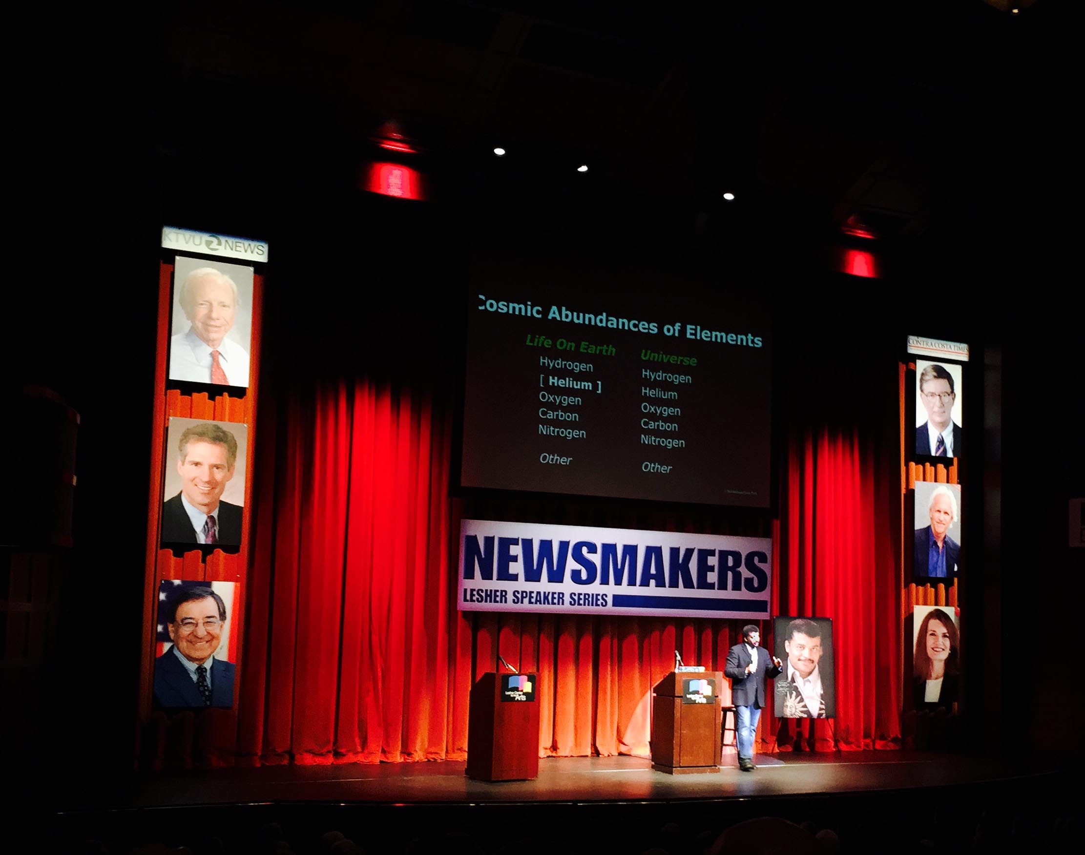 Then the famous guy himself took the stage, and things shifted into high gear. Tyson came out in pressed jeans, an open neck shirt and a sport coat. He’s completely at ease in front of people, warm, engaging and funny. Cosmos was on Fox TV. Riffing on Fox, Tyson pointed out that there are many Fox channels, and only Fox news is ostentatiously anti-science.