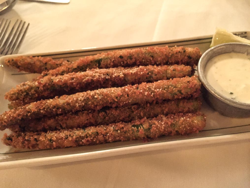 Breaded and fried asparagus, accompanied by a dipping sauce of boursin cheese.