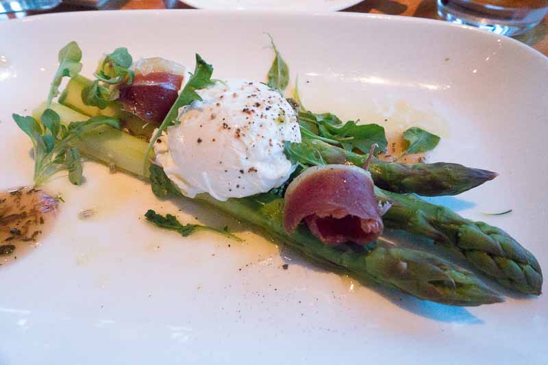 Asparagus, poached egg and duck prosciutto.