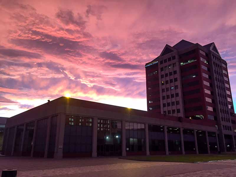 Indianapolis is at the far western edge of the Eastern time zone, so the sun comes up late and goes down late. It was 9 pm when we walked out to dinner, and this was the spectacular sunset: