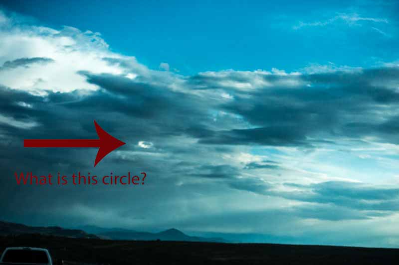 Probably that isn’t the mark a flying saucer leaves when it breaks through a cloud. Probably. But a perfect circle of light in the middle of a huge cloud? Glad I had the camera handy.