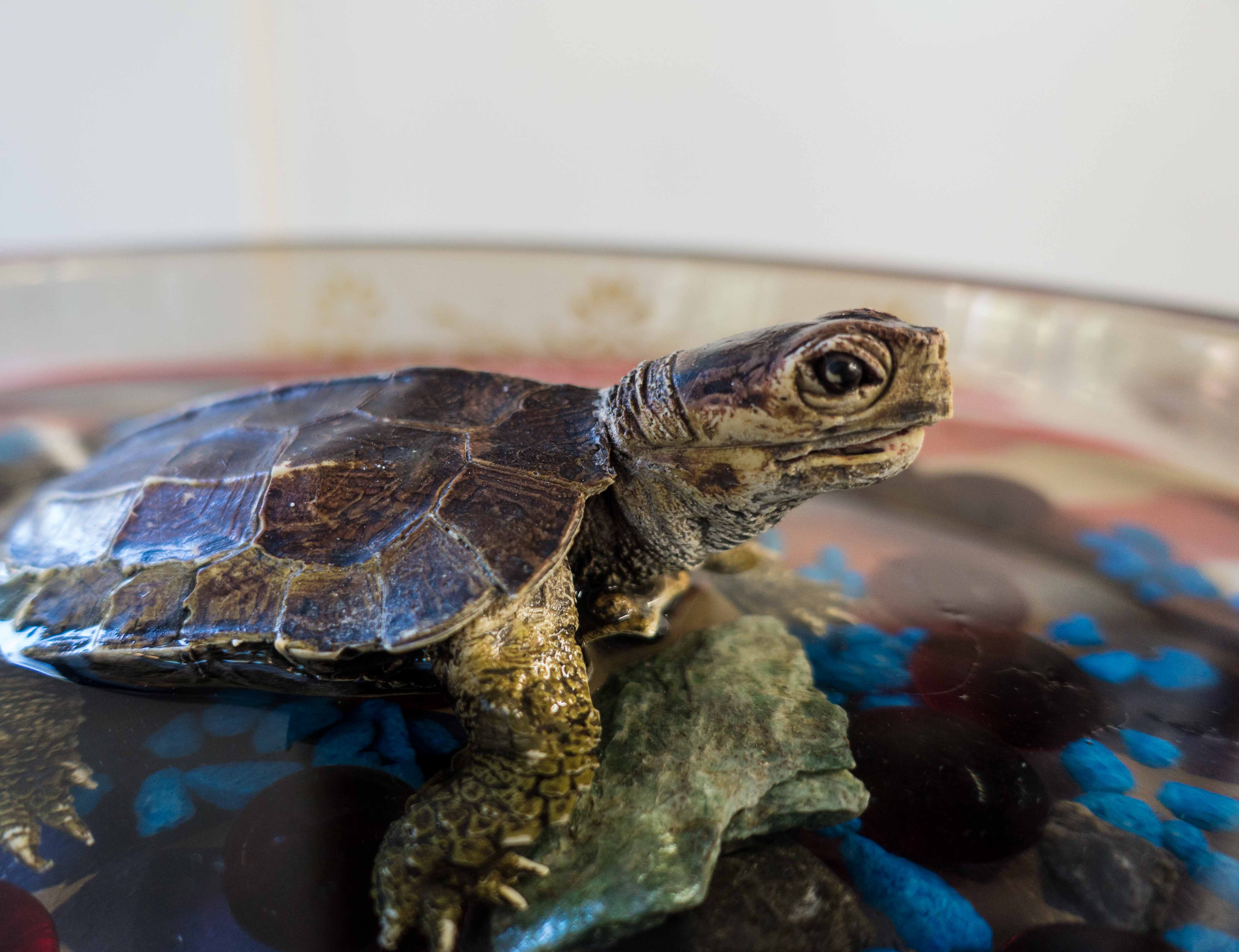 On the counter, next to a vase full of plastic flowers, is a bowl of water with a rock and a turtle. I asked if the turtle is real and the waitress said she never answers that question, only tell people the critter’s name.