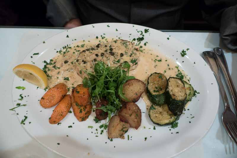 Gail and Margaret both had the calamari steak. This is always a bit of a gamble–it is either great or awful, with little middle ground. Fortunately, Luna serves a good one, on a platter with potatoes and veggies: