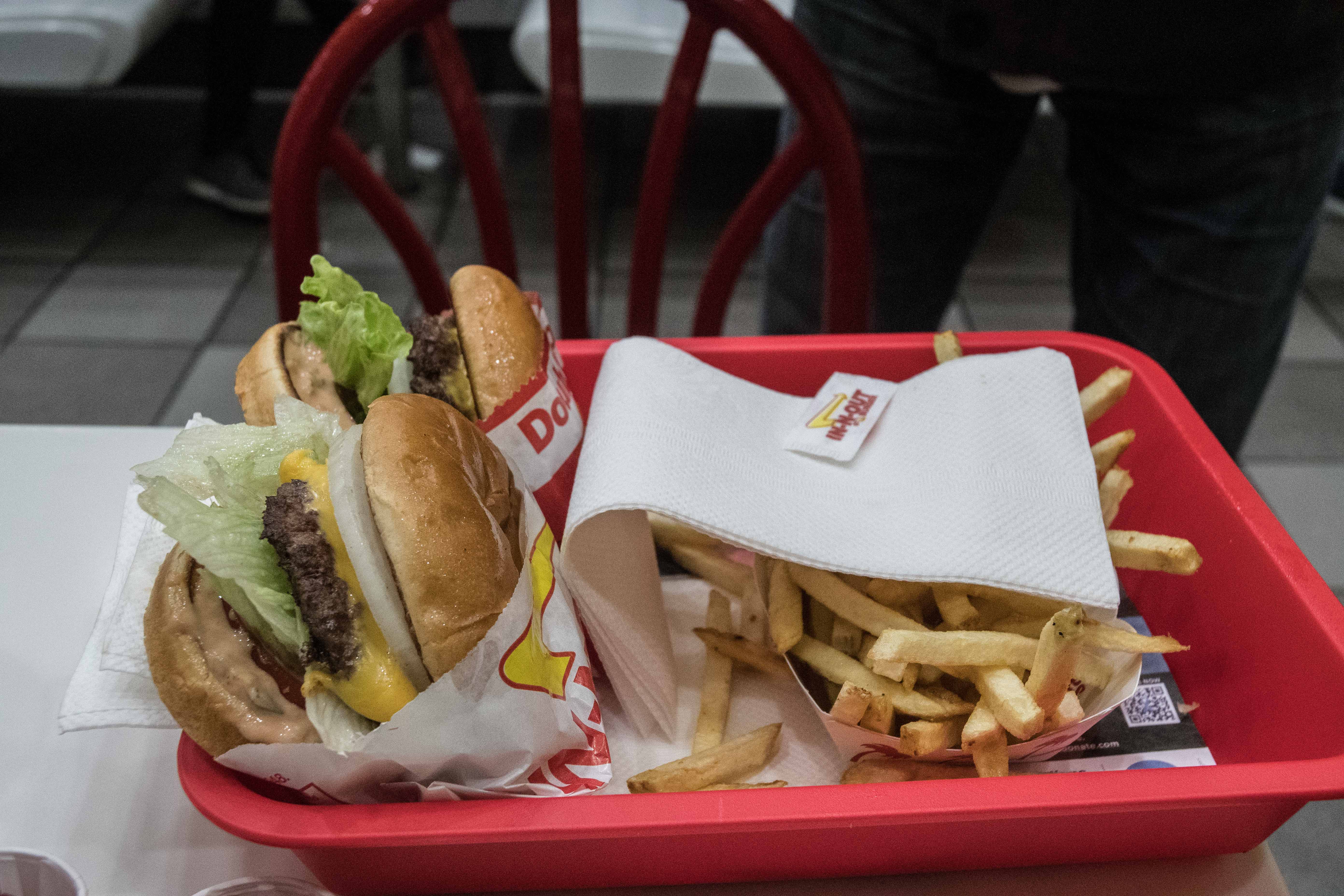 A cheeseburger for me and a Double-Double for Harry.