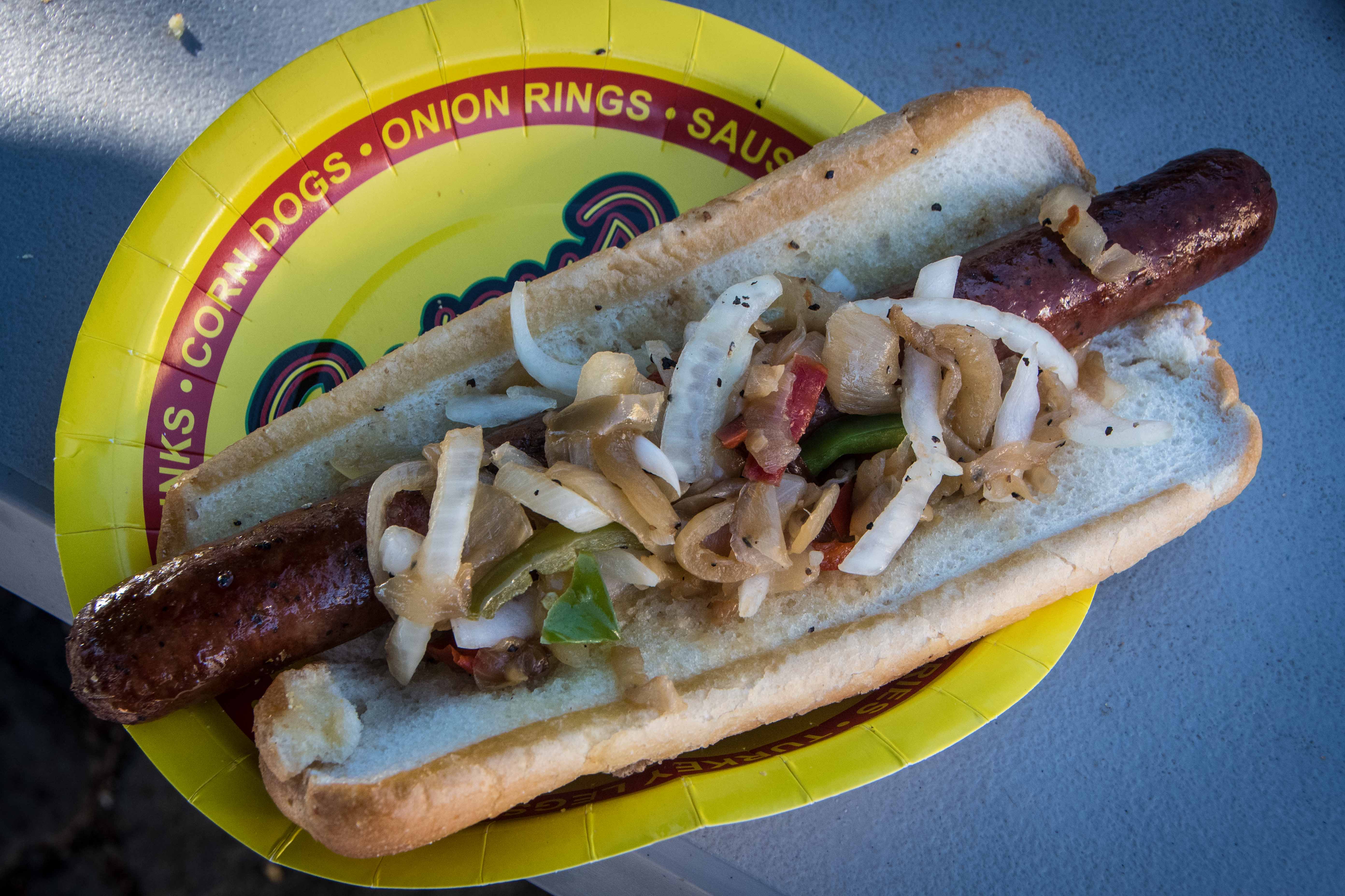 Classic county fair food–an enormous sausage with onions and peppers.