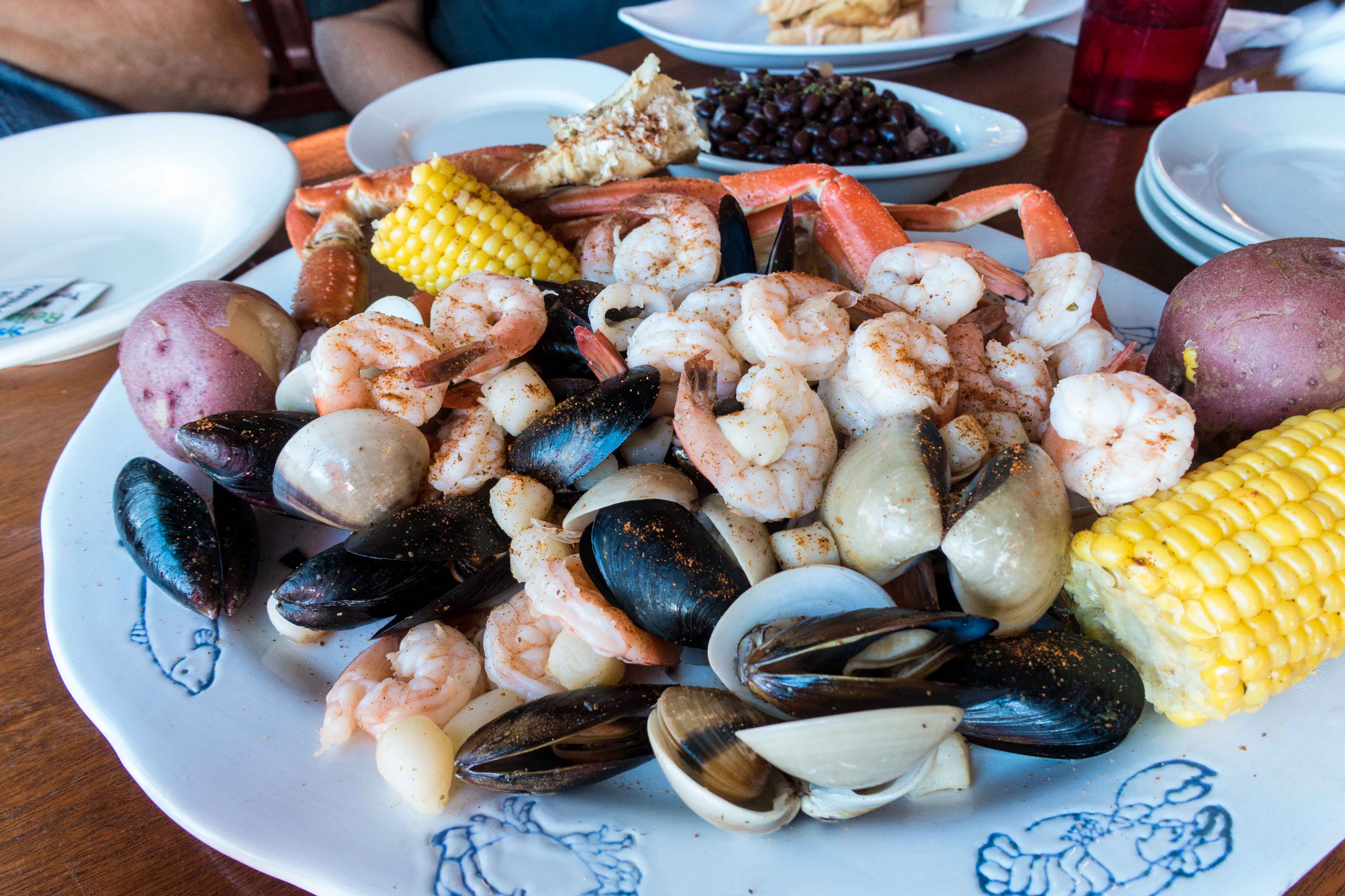 Shrimp, bay scallops, clams, mussels, calamari, snow crab, corn and potatoes.