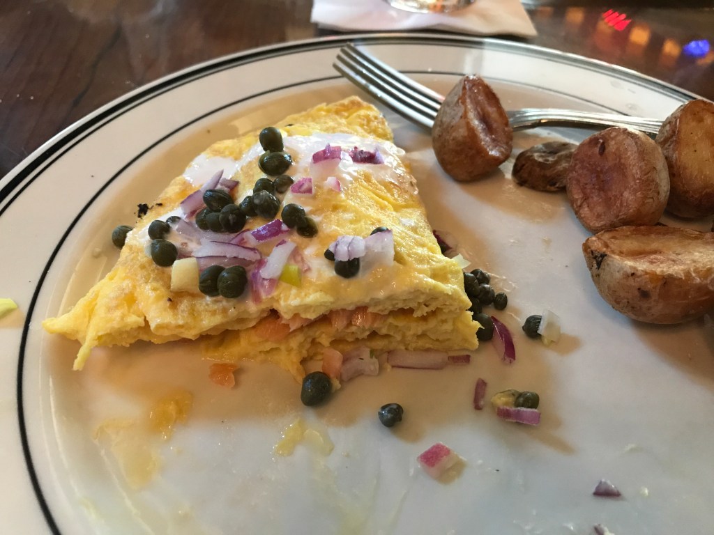 Often when a dish promises three eggs, it’s because management is buying tiny eggs. They are cheaper and three sounds better on the menu.  Not here.  My omelet was clearly 3 large eggs.   The salmon was excellent, the capers made me think the traditional bagels and lox had been transformed to an omelet.  The potatoes were decent, certainly different.  Some more salt would have been nice, but mostly they were dry–no butter. Probably healthier that way, but who eats breakfast out to be healthy?