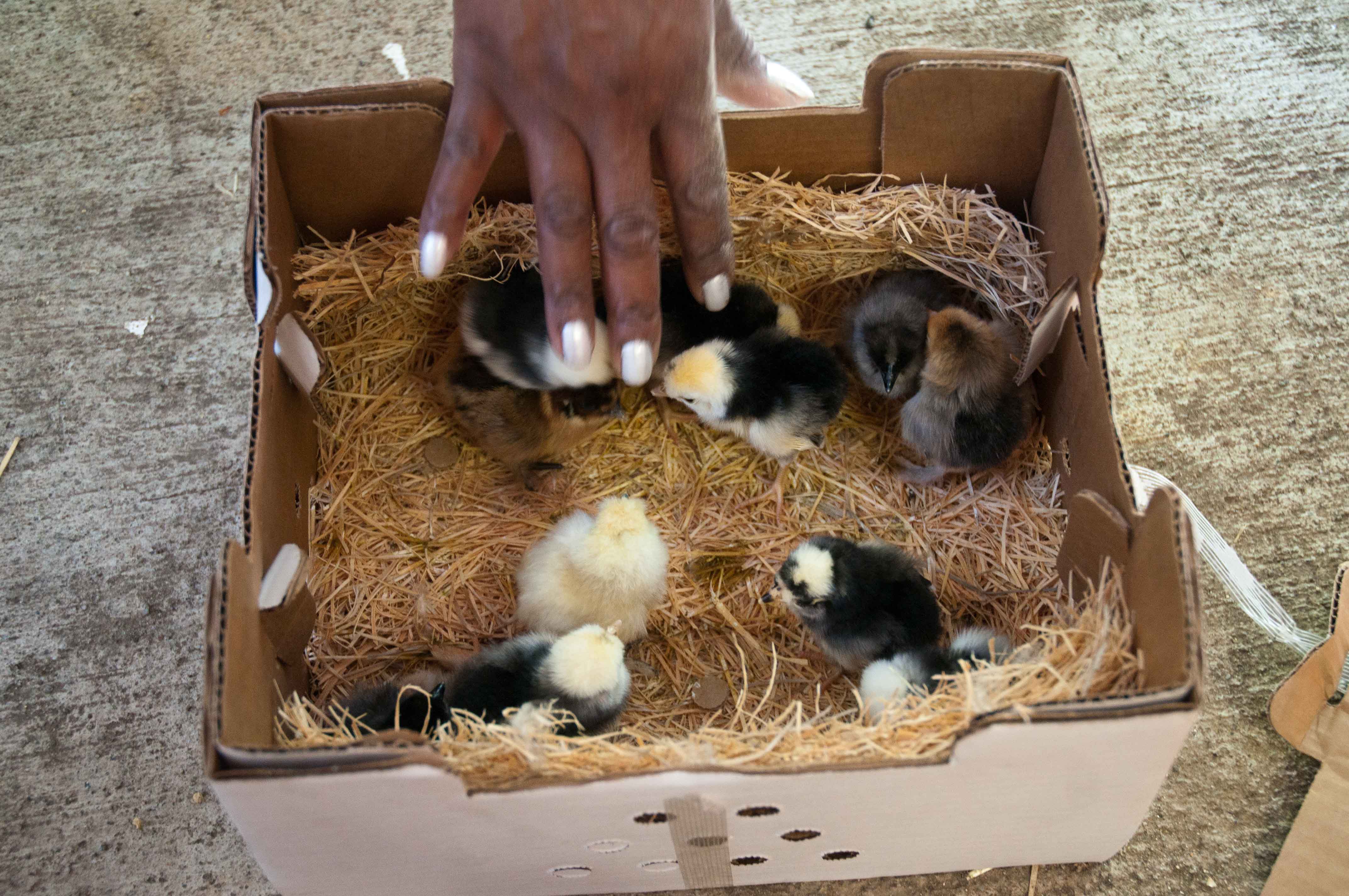 We prep the coop with fresh bedding, food, water and a heat lamp–babies need to be kept very warm for the first couple of weeks, and they don’t have a momma to hide under.